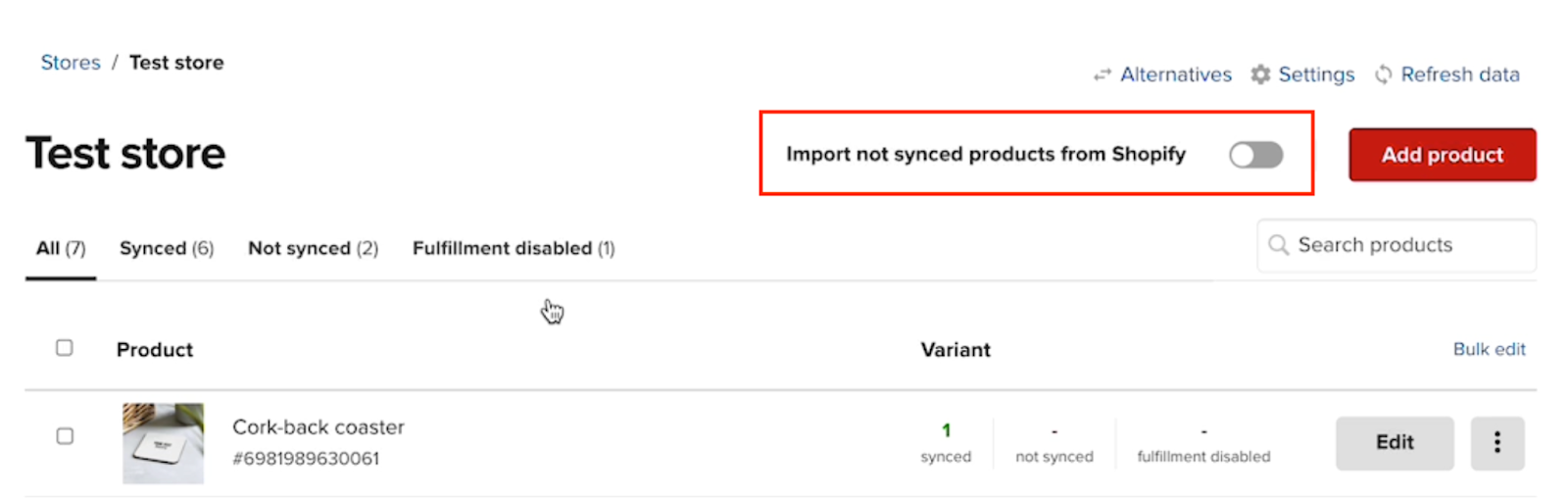- Allez dans Boutiques, cliquez sur votre boutique et activez la case à cocher Importer les produits non synchronisés de {votre plateforme}. Cela lancera l'importation de produits non-Printful.