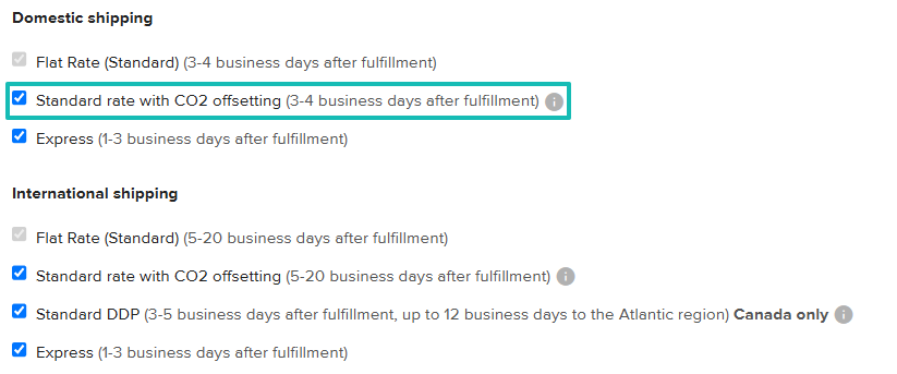 - Utenti delle tariffe di spedizione in tempo reale: Puoi abilitare questa opzione andando su Dashboard ➝ Impostazioni ➝ Impostazioni del negozio ➝ Spedizione ➝ Tariffa standard con compensazione del CO₂.
