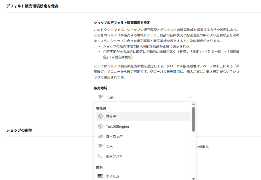 アカウントに接続された各ストアには、独自の販売地域設定があります。この設定により、ストアに追加できる商品が決まり、 在庫同期機能 に影響します。アカウント単位の販売地域により商品がカタログに表示されていても、その商品がストアの地域で利用できない場合、 ストアに追加することはできません。